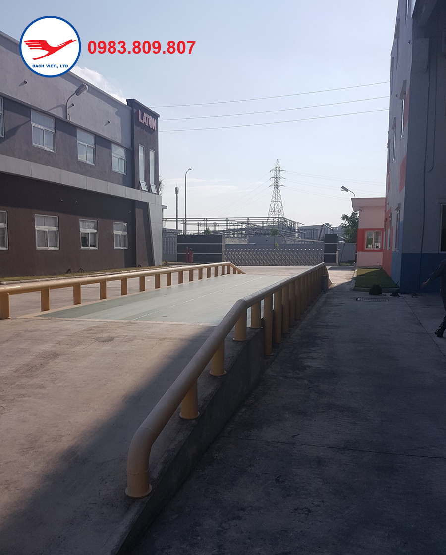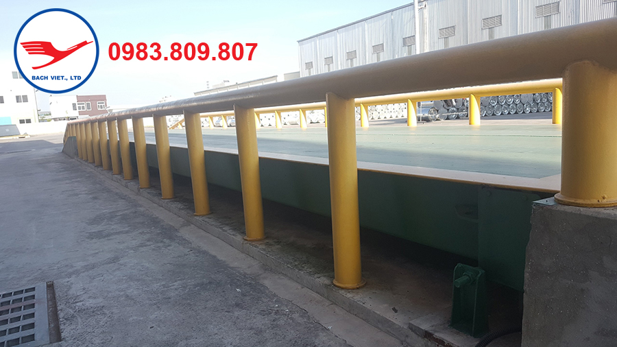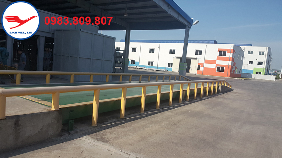 Hình ảnh thực tế cầu cân điện tử 60 tấn dài 12m lắp đặt tại Bắc Giang. Cân được lắp đặt theo kiểu nổi có thêm hàng lan can chắn lắp bết dưới nền, đảm bảo an toàn tuyệt đối cho xe tải lên cân.